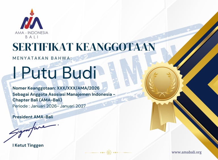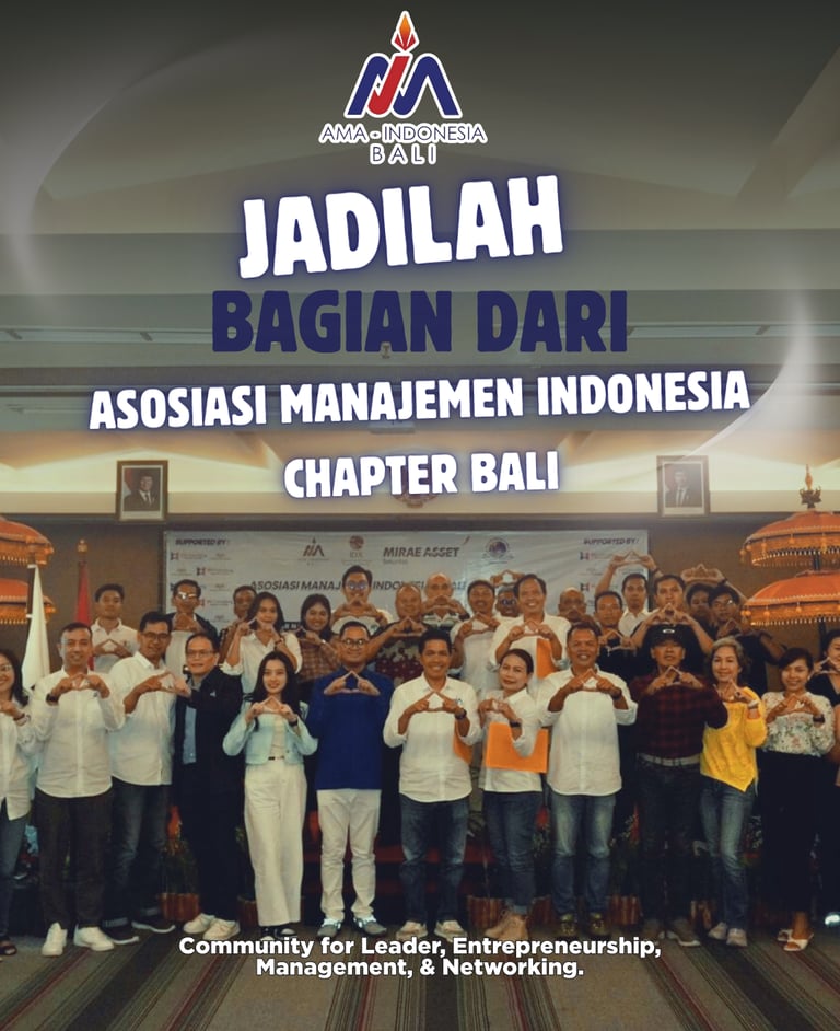 Asosiasi Manajemen Indonesia (AMA) Chapter Bali mengajak para praktisi, akademisi, pemilik bisnis, dan mahasiswa untuk bergabung dalam komunitas manajemen eksklusif guna memperluas networking, meningkatkan kredibilitas profesional, dan mengakselerasi pertumbuhan karier di era digital.